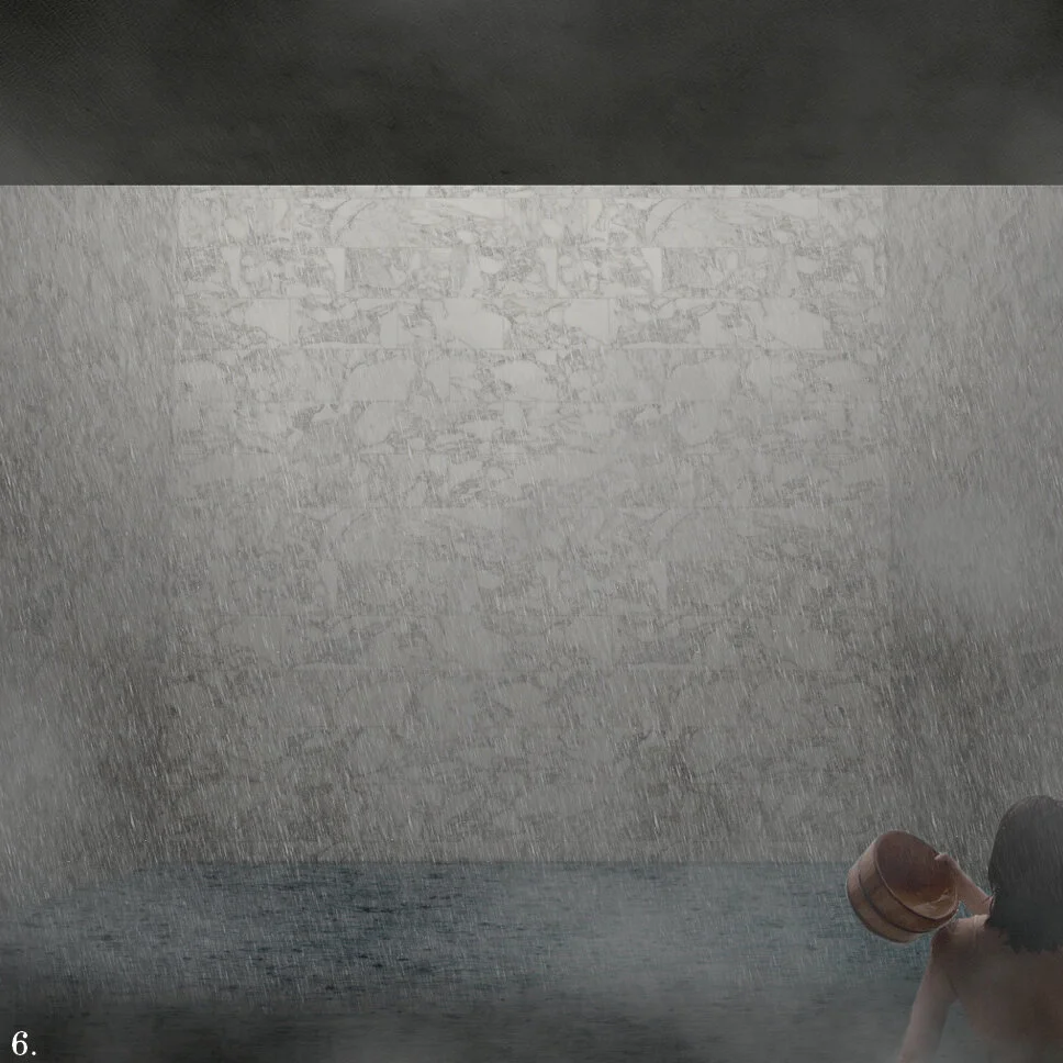 This public competition provided the office with an opportunity to explore the potential for reunification of people along a fabricated line. The text from the entry reads: Korea is a land of a single people, currently divided by an artificial separation. Architecture has the capacity to bring alternate meaning to what is currently a site rife with contention. By using this moment to reconnect people and families, RESERVED presents a resolutely optimistic outlook, one intended to quietly mold a progressive future. Presuming forthcoming unification, RESERVED proposes to establish a communal bathhouse within an ad hoc natural reserve, where both urban and emotional growth may germinate. Situated on the current border between North and South Korea, access to the RESERVED Bathhouse begins with a switchback descent, crossing from North to South and South to North multiple times, eroding the meaning of the line as bodies and light descend into the earth. On disrobing in the passage through the Change Rooms, visitors arrive in a singular Jjimjilbang space where individualities and national identities have faded away. Delineated by the scattering of columns supporting the belly of the earth above, the space is the first area of reminder of the people’s unity. Crossing beneath the mass of the entry ramp, one is met with sleeping rooms tucked into the same volume. Separating at this point by gender, but not by nationality, the visitors move into a sequence of spaces, beginning with the Rain Room, cleansing them prior to their moving from pool to pool. Along the procession, the exterior of the RESERVED landscape drops into the timeless ruin of the underground building, providing a connection to both the light and the land. Each of these moments occurs along the current border, again bringing to the fore the land the people share, rather than the border which keeps them apart.